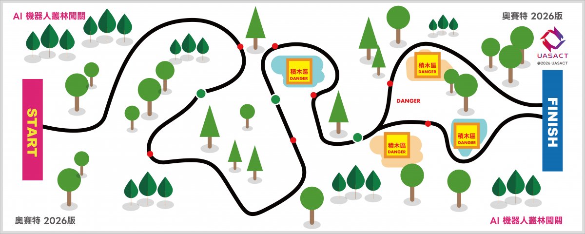 3.叢林車道的障礙物軌跡線上前後方約30-50公分各有2個警示的紅點,由紅色膠帶貼成,必須機器人從紅點區間繞過圓柱障礙物,在繞行圓柱障礙物時,也要避開附近的險坡或湖泊。