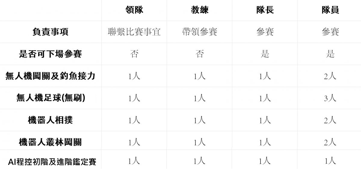 表列隊員人數限制(除無人機足球3人和鑑定賽1人外)其他隊員可以1人但不可超過2人